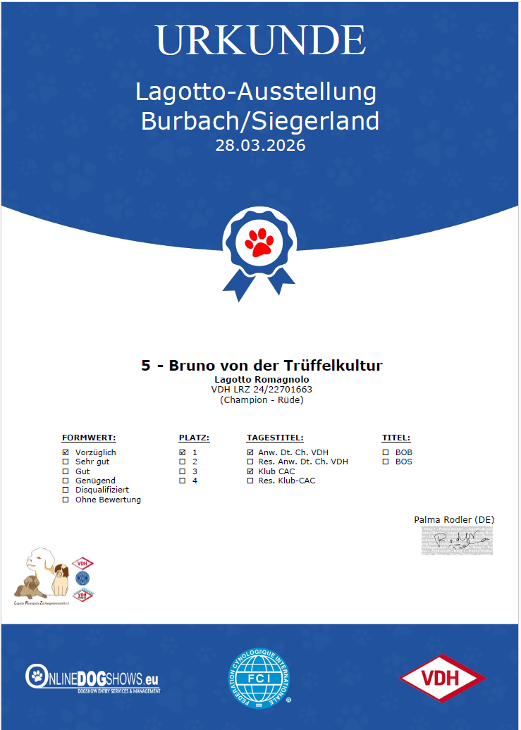 ![]() ![]() Vorzüglich 1. Platz / BOB / Anw. Dt. Ch. VDH / Klub CAC |