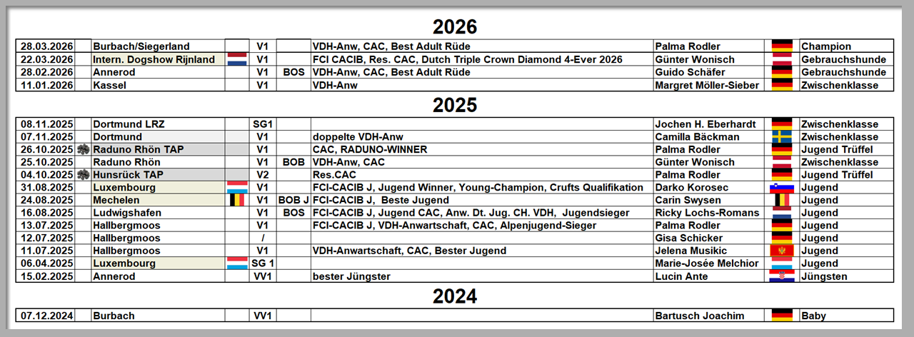 ![]() ![]() ![]() Vorzüglich 1. Platz / Anw. Dt. Ch. VDH / CAC / BOS / Best Head / Klubsieger 2026 LRZ |