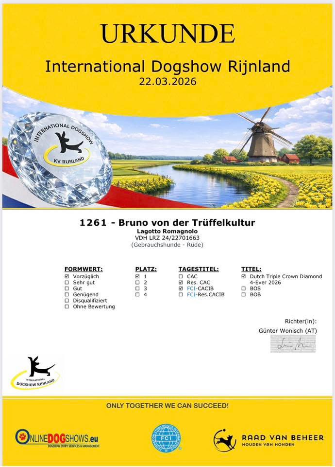 ![]() Vorzüglich 1. Platz / CACIB / Res. CAC / Dutch Triple Crown Diamond 4-Ever 2026 |